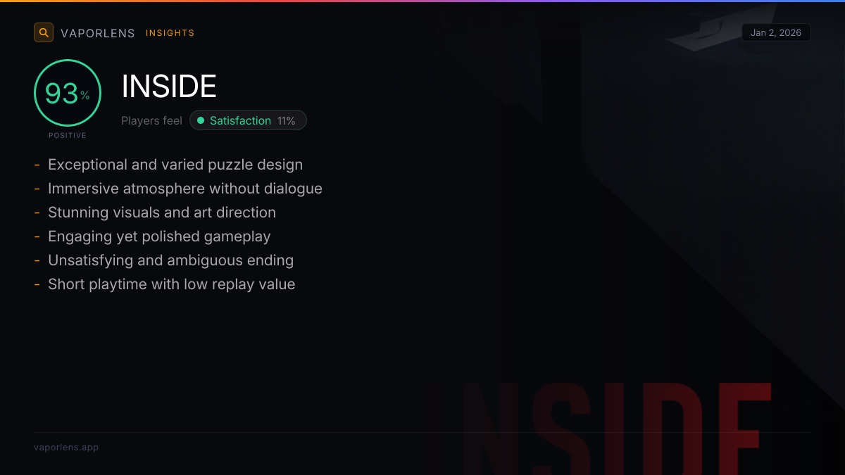 Players experience satisfaction due to the game's well-designed puzzles, balanced difficulty, and polished mechanics. The depth of the story, atmospheric art style, and overall presentation contribute to a fulfilling experience, especially when overcoming challenges or unlocking alternate endings. Many also highlight the game's value for money and improvements over its predecessor, Limbo.