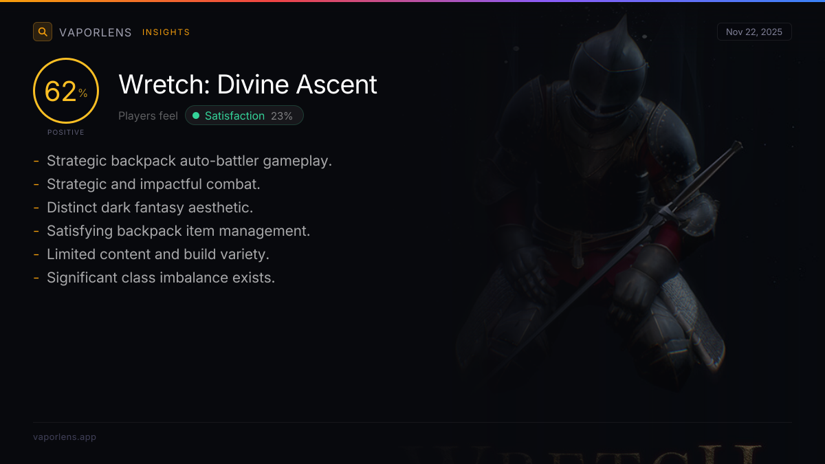 Players feel satisfied due to the engaging and impactful combat system, strong strategic depth with varied builds and replayability, and the overall high quality and value of the game. Developer responsiveness to feedback and bug fixes also contributes significantly to positive player sentiment.