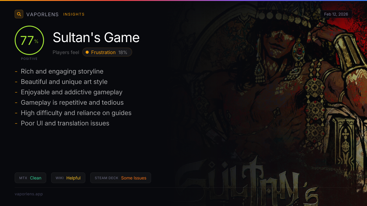 The analysis of user reviews for Sultan's Game reveals a mixed perception of its pricing and monetization. While some users find the base game overpriced, others express a strong desire for additional paid content, indicating a willingness to spend more if valuable content is provided. Notably, there are no major concerns about aggressive monetization practices, with one review explicitly stating that the game does not feel like a cash grab. This suggests that the game's monetization is relatively fair and not predatory. Score: 20 / 100