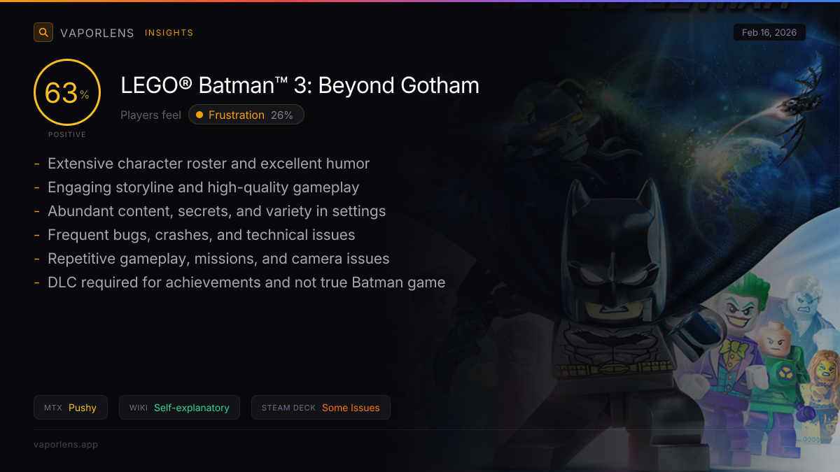 The analysis of user reviews for the game reveals several key themes related to its monetization and DLC strategy. A significant number of users express frustration with achievements being locked behind paid DLCs, which is seen as a predatory practice forcing additional spending. Many reviews also highlight that the DLCs are overpriced and not worth the regular cost, recommending purchases only during sales. There are mixed feelings about the value of the DLCs, with some users appreciating certain aspects while finding others annoying. Overall, the monetization strategy, particularly around DLCs, is a major point of contention among users. Score: 65 / 100