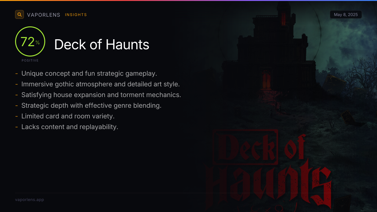The game's core concept, which involves playing as a villainous haunted house, strategically combining base building, card gameplay, and rogue-like elements, is widely praised as fun, engaging, and well-executed. Players enjoy the unique blend of mechanics and the overall premise.