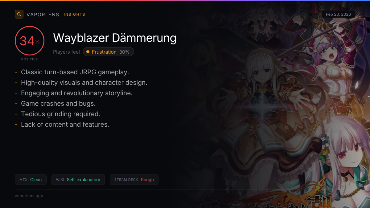 The Steam Deck experience is marred by significant stability issues, including frequent crashes and pop-ups that disrupt gameplay. Additionally, there are critical problems with text display, particularly for non-English languages, which can make the game unplayable for some users. While there are positive notes on visual improvements, these are overshadowed by the severe technical barriers. Score: 100 / 100