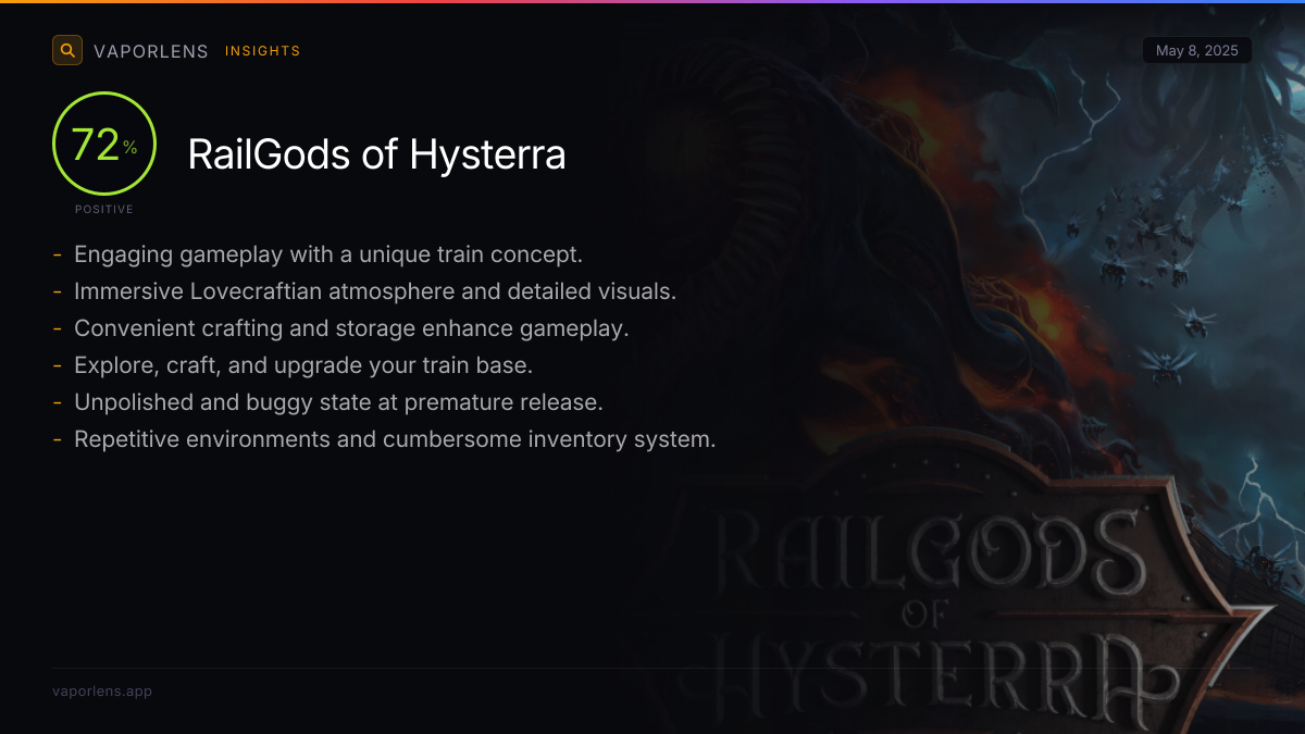 The game is captivating and enjoyable, especially in co-op, due to its original mechanics, polished gameplay, and strategic depth. A key feature is the unique concept of a living, customizable train that players must feed and upgrade while exploring a Lovecraftian world, offering a fresh take on the survival genre.
