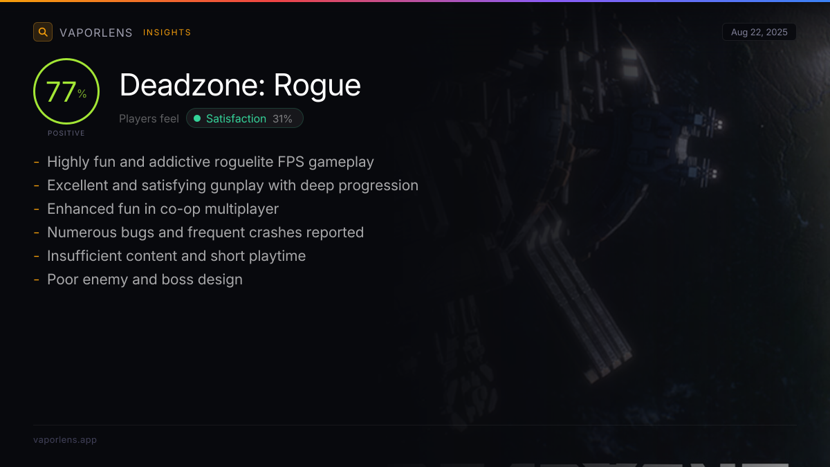 | Players consistently praise the game for its high entertainment value, addictive gameplay loop, and overall fun factor. Many find it easy to sink hours into the game without noticing, highlighting its engaging nature and replayability. | 88% |