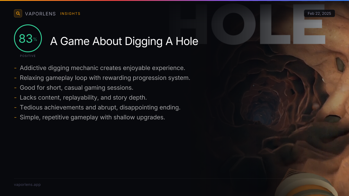 The game is recommended for players who enjoy digging, mining, or simulation games. Some reviewers compare it favorably to similar titles like "Powerwash Simulator" or "Lawn Mowing Simulator". However, some reviewers suggest there are better digging games available.