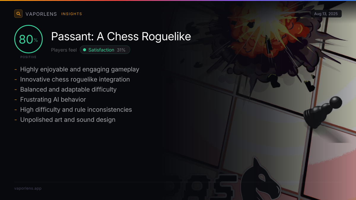 Players are highly satisfied with the game's core concept, its unique blend of chess and roguelike mechanics, and the strategic depth it offers. The adaptable difficulty, engaging gameplay, and generous content in the full release contribute significantly to this positive emotion, often fulfilling a desire for a deep yet relaxing puzzle experience. The game's quality, active development, and value for money are also frequently cited as sources of satisfaction.