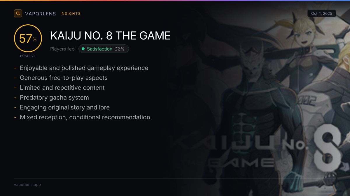 The game primarily appeals to existing fans of the Kaiju No. 8 manga and anime franchise. Many reviewers are long-time players of the mobile version and are invested due to their love for the source material.
