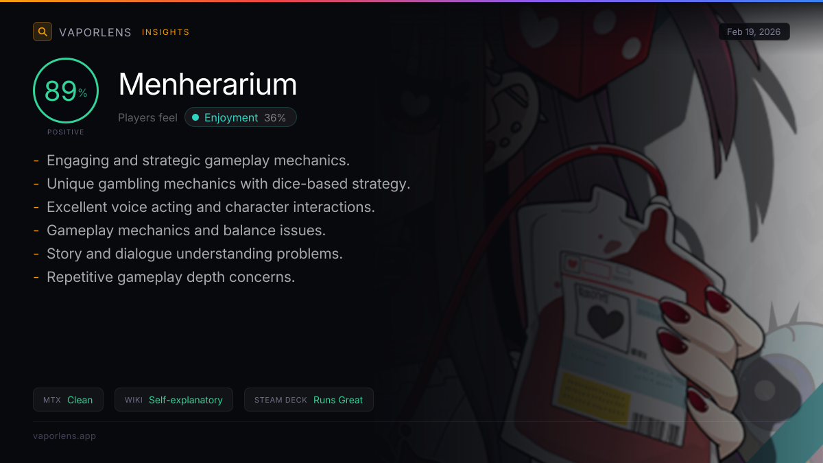 Players appreciate the game's unique blend of roguelite mechanics, gambling elements, and character interactions. The addictive gameplay, dynamic character interactions, and satisfying mechanics contribute to an overall positive experience.