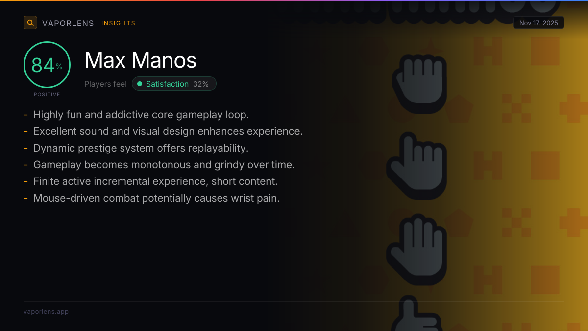 Players feel satisfied due to the game's well-executed core loop, rewarding progression, and the freshness introduced by varied gameplay mechanics, particularly the prestige system. The game's good value for money, pleasant aesthetics, and clear ending also contribute significantly to a positive overall experience.