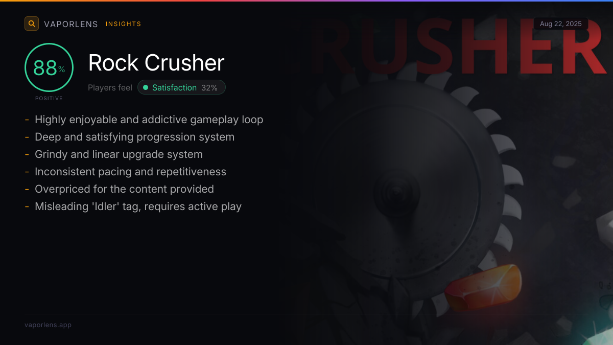 Players overwhelmingly find the game to be a highly enjoyable, addictive, and well-made incremental experience. Many highlight its simple yet satisfying loop, good value for money, and ability to provide several hours of engaging gameplay without overstaying its welcome. The game successfully captures the essence of a good idle/clicker game, leading to extended play sessions.