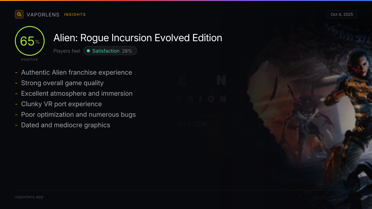 Players are highly satisfied with the game's immersive atmosphere, sound design, and graphics, which effectively capture the essence of the Alien franchise. The game's strong narrative, compelling characters, and well-implemented gameplay mechanics, including dynamic combat and intelligent Xenomorph AI, contribute significantly to a positive overall experience. Additionally, good optimization, smooth performance across various platforms (including VR and Steam Deck), and a perceived good value for money enhance player enjoyment.