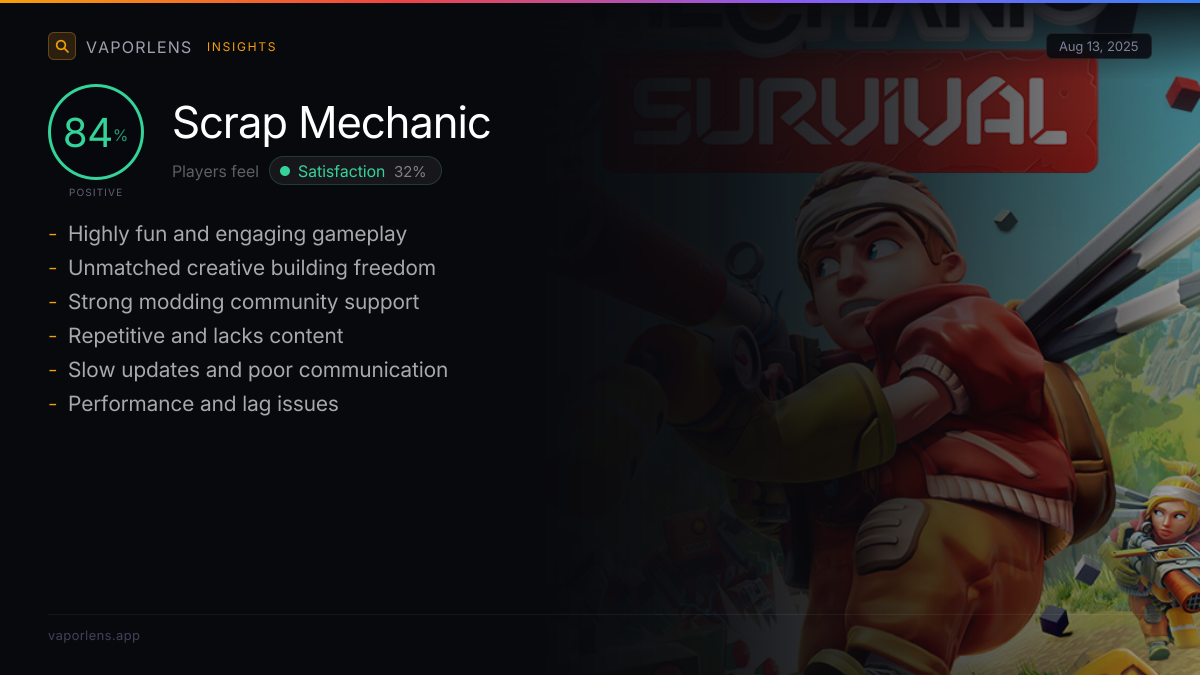 Players feel satisfied primarily due to the extensive creative freedom and robust building mechanics, allowing them to design and construct complex machines and vehicles. The game's overall quality, engaging gameplay, and the rewarding experience of seeing creations work as intended also contribute significantly to this emotion. Additionally, multiplayer experiences and the active modding community enhance long-term enjoyment and replayability.