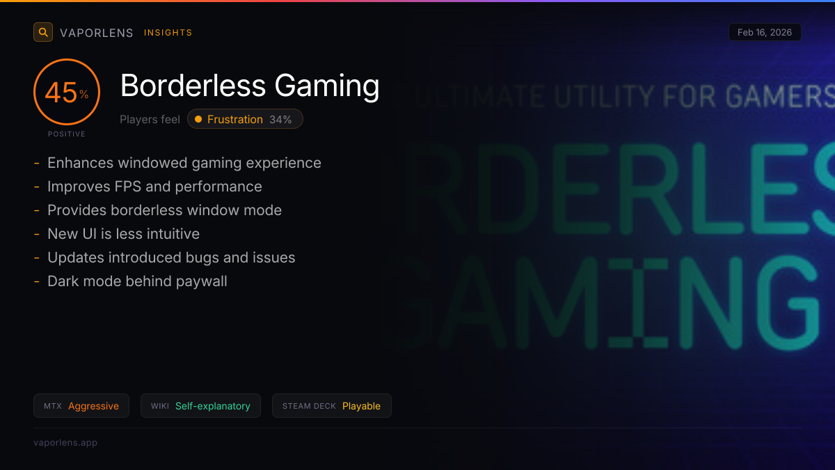 The analysis of user feedback reveals several key themes. Compatibility issues with Linux and stability problems, such as crashes and black screens, are significant concerns that negatively impact the user experience. Additionally, there are issues with the user interface, particularly with full-screen exclusivity and task switching. However, there is also positive feedback regarding specific features like upscaling, which users find beneficial and well-implemented. Score: 50 / 100