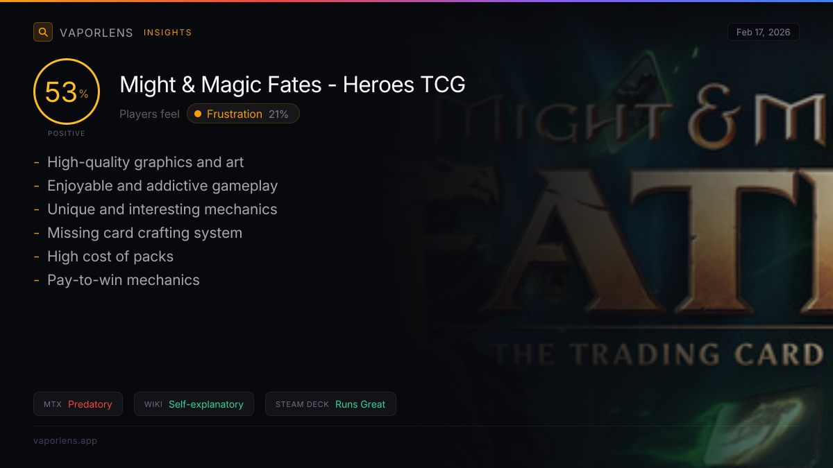 The game exhibits several predatory monetization practices, including pay-to-win mechanics, expensive card packs, and a significant grind for free-to-play users. The presence of a Battle Pass and concerns about its implementation further raise red flags about the game's monetization strategy. Score: 90 / 100