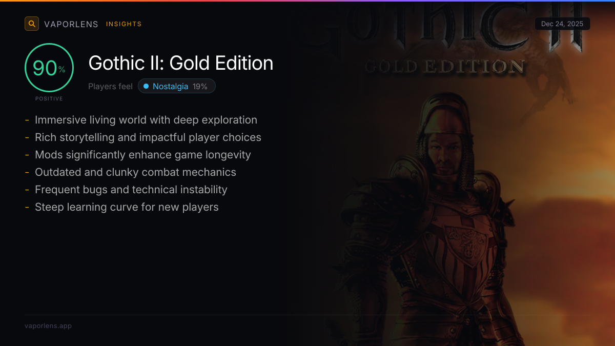| Gothic II refines and expands upon the first game with better controls, more quests, improved balance, and enhanced atmosphere. Players note it as a bigger and more polished sequel. | 43% |