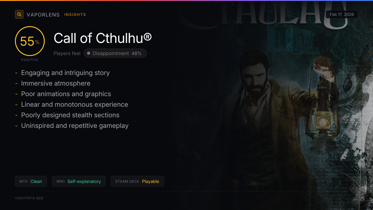 The game experiences significant issues with frequent crashes and network connectivity problems on the Steam Deck. However, many users also report a positive experience with good performance and controller support. The graphical quality is noted to be dated by some users. Score: 50 / 100
