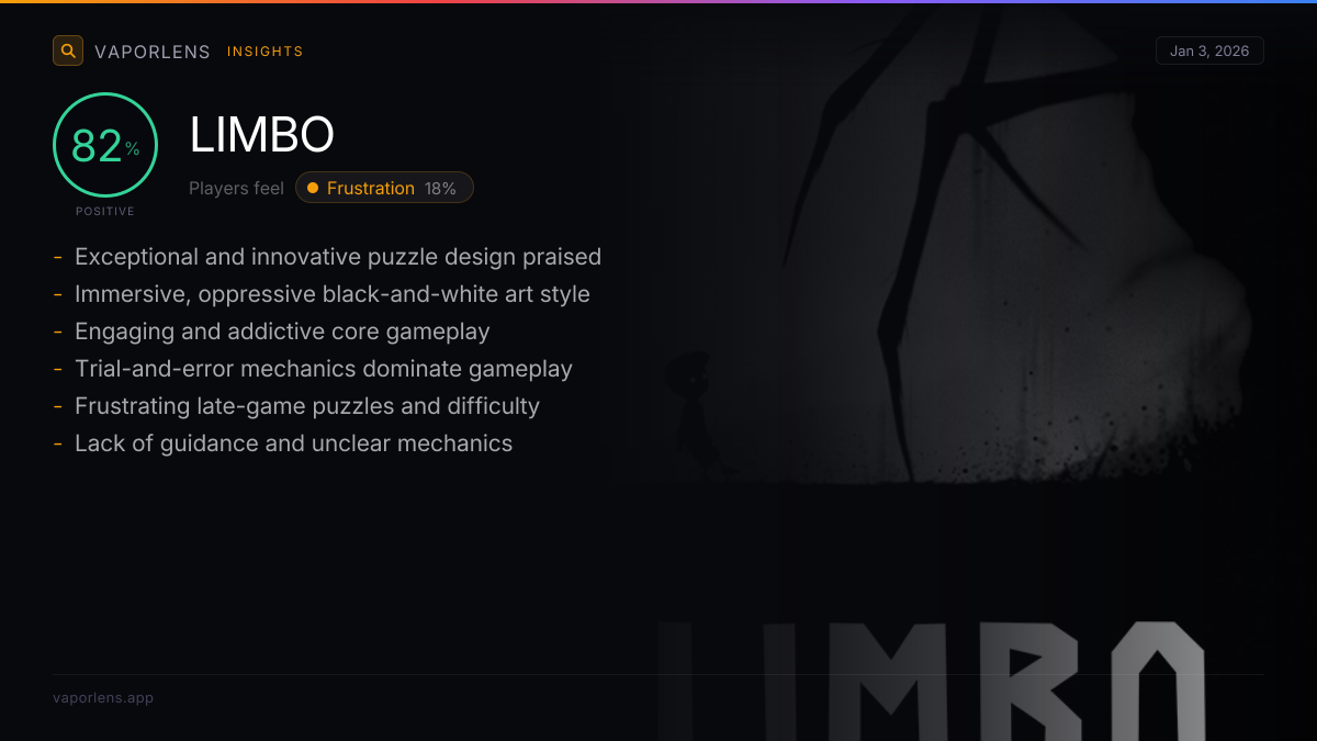 Players appreciate the game's artistic direction, atmospheric storytelling, and intelligent puzzle design. The simplicity and elegance of its mechanics, combined with its emotional and thematic depth, are often cited as reasons for admiration, particularly its influence on the puzzle genre and indie games.