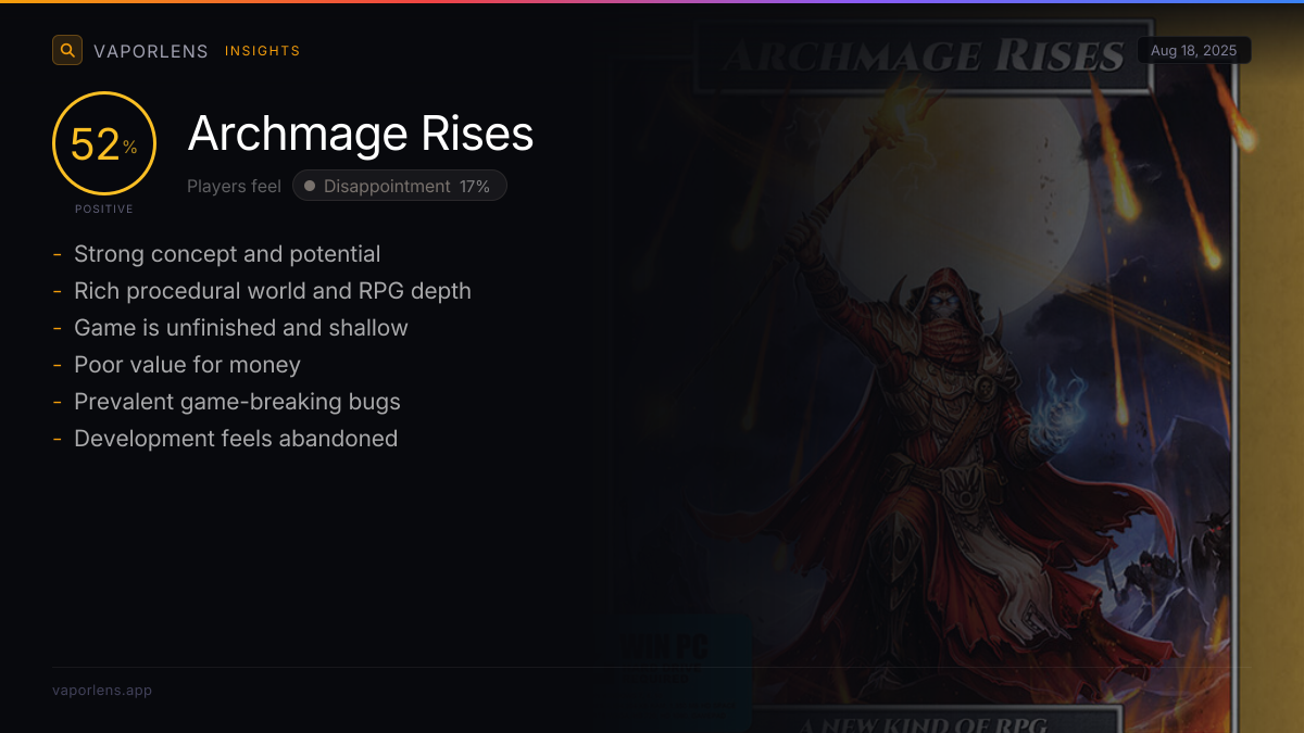 Players expressed disappointment due to the game's unfinished state, including missing advertised features, game-breaking bugs, and a general lack of content and polish despite its price and development time. This was compounded by a perceived lack of developer communication and slow updates, leading to feelings of the game being abandoned or 'undercooked'.