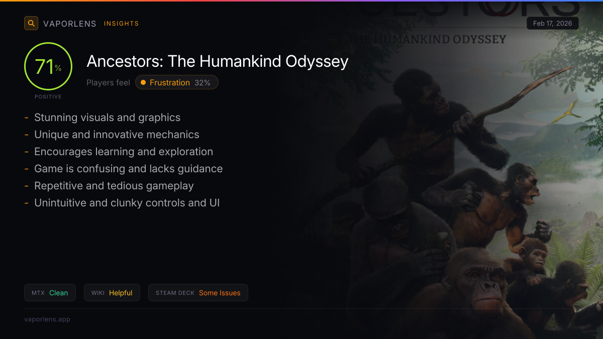 The game has significant issues with controller support, gameplay mechanics, and stability. Users report difficulties with controls, unintuitive processes, and frequent bugs, leading to a frustrating experience. Score: 60 / 100