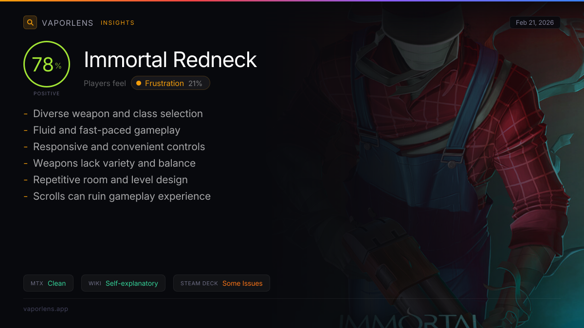 The game has significant stability issues, particularly with certain weapons causing frequent crashes. However, it offers full controller support, which is a positive aspect. The crashes also lead to lost progress, adding to user frustration. Score: 70 / 100