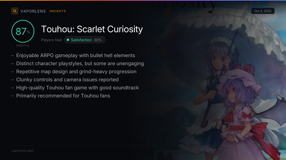 The game is highly recommended for fans of the Touhou series, especially those interested in 3D Touhou games or ARPGs. It serves as a good entry point for newcomers to the Touhou universe, but its appeal is significantly amplified for existing fans.