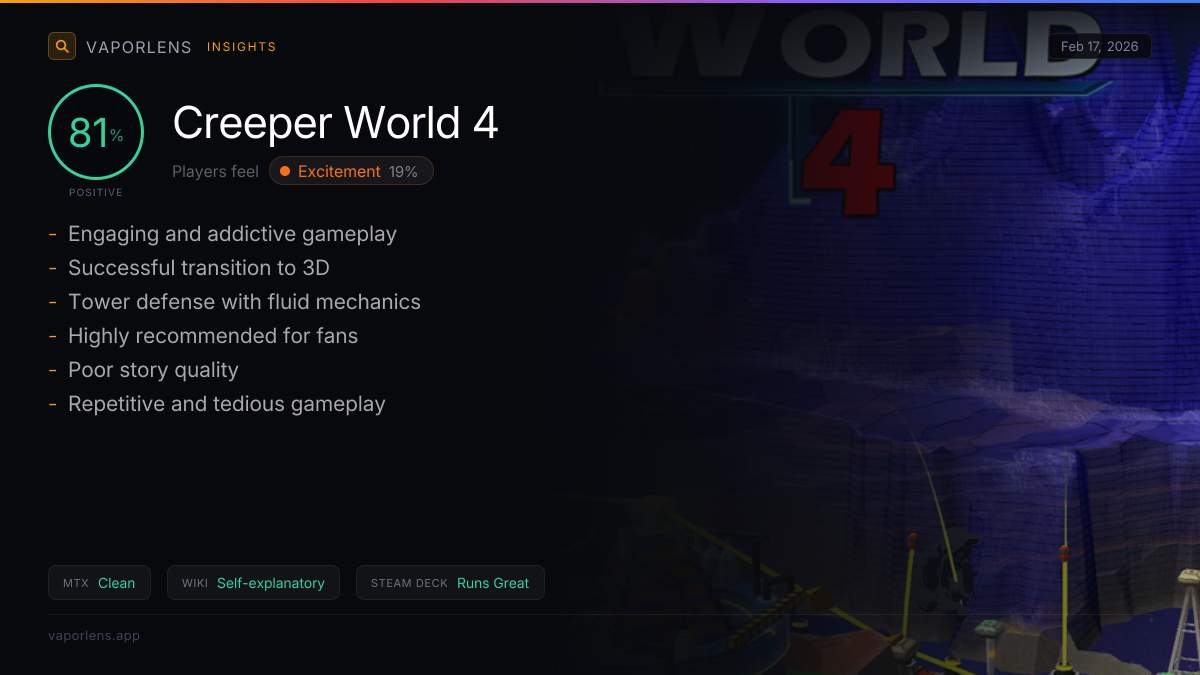 The game is highly recommended for fans of the Creeper World series, fans of the genre, and those who enjoyed previous installments. Many reviews suggest it is a must-have for those familiar with and fans of the series.