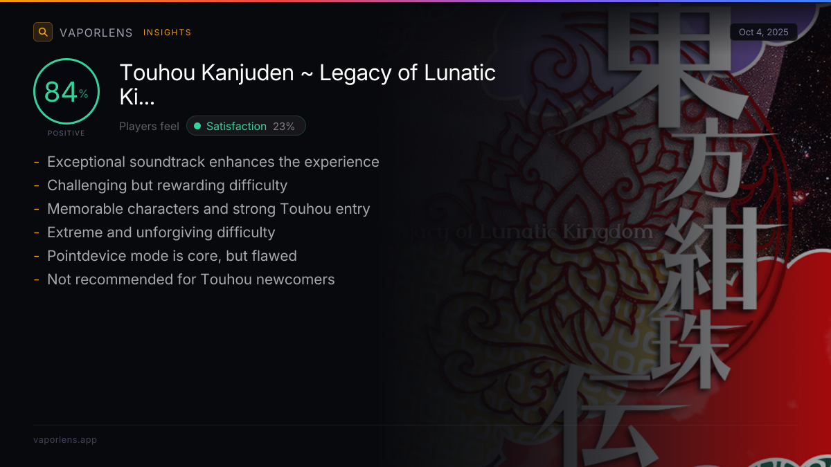 Players overwhelmingly report the game as exceptionally difficult, often comparing its 'Normal' mode to 'Hard' or 'Lunatic' modes in other Touhou titles. This high difficulty, characterized by steep learning curves, numerous first-time traps, and relentless bullet patterns, leads to significant frustration and a feeling of being overwhelmed, even for series veterans. The game's difficulty is widely considered the highest in the Touhou series.