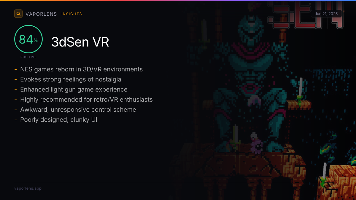 The emulator provides a novel way to experience classic NES games by converting them into 3D and VR environments. This enhances immersion and nostalgia, making the games feel fresh and engaging. Many reviewers highlight the impressive visual transformation and the unique experience of revisiting childhood favorites in a new dimension.
